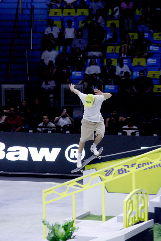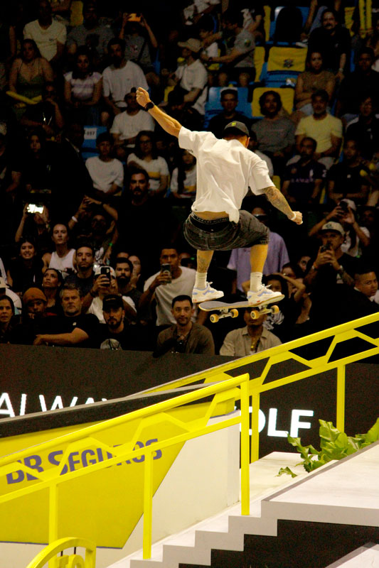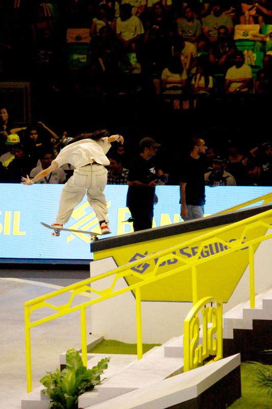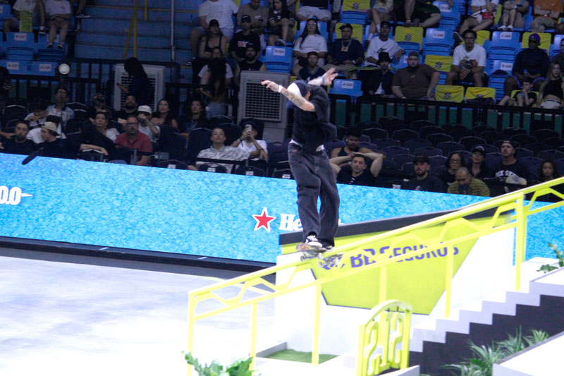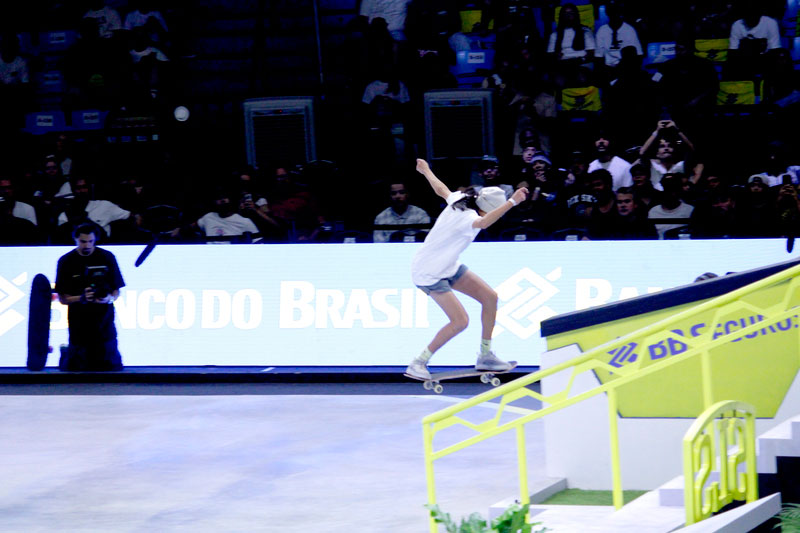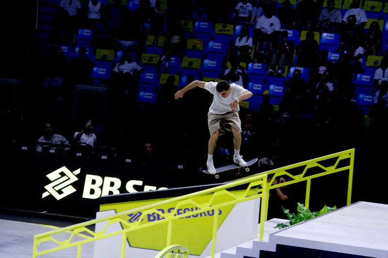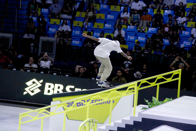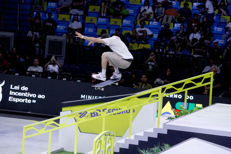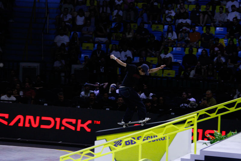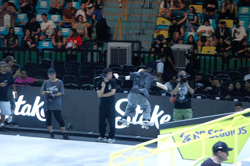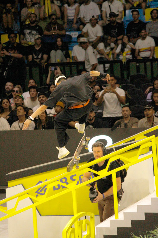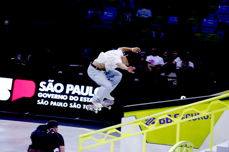 Na sequência, foi a vez da final masculina incendiar o Ginásio do Ibirapuera. Os classificados das eliminatórias — os japoneses Sora Shirai, Kairi Netsuke, Ginwoo Onodera e o peruano Angelo Caro — se juntaram aos líderes do ranking, Nyjah Huston e o brasileiro Giovanni Vianna.